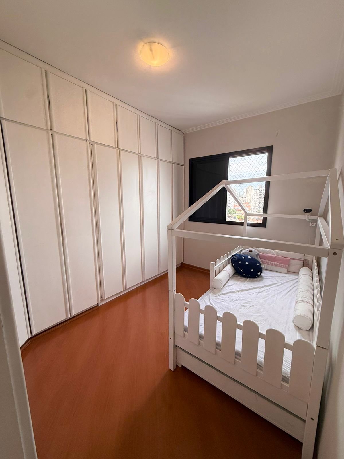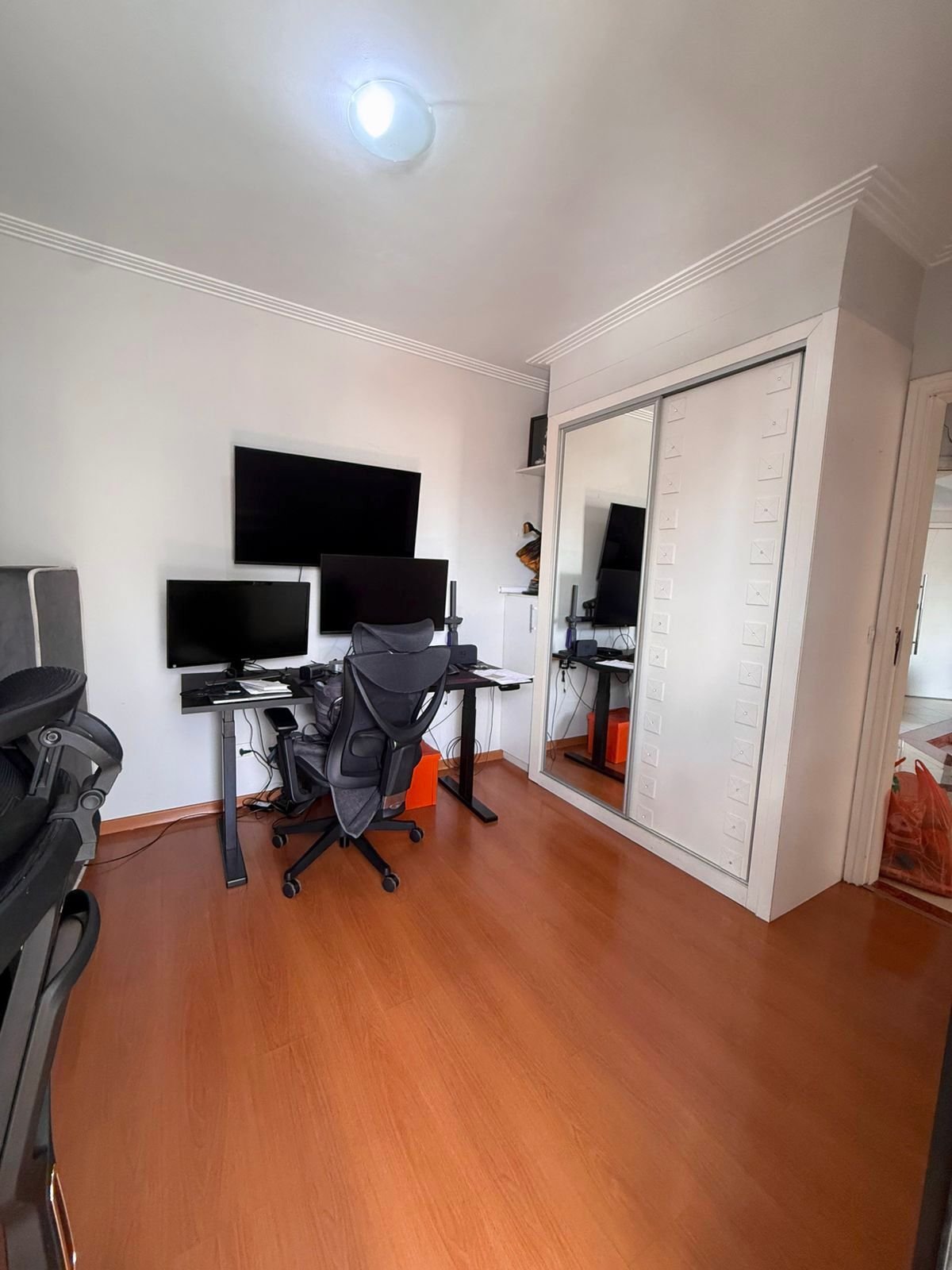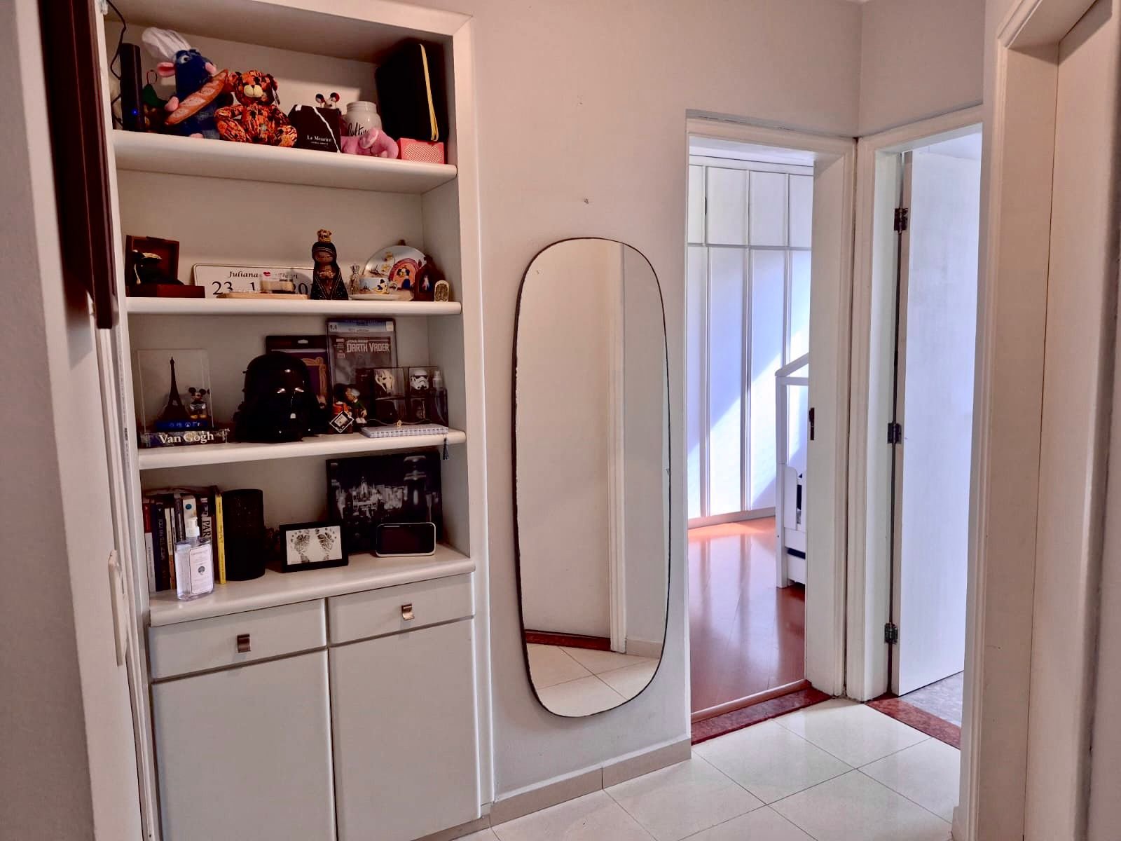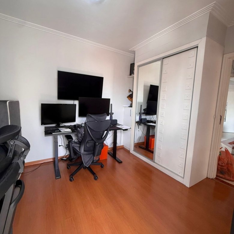 A área íntima é separada da sala por porta, criando um ambiente mais reservado e silencioso, perfeito para quem valoriza organização e harmonia no dia a dia.