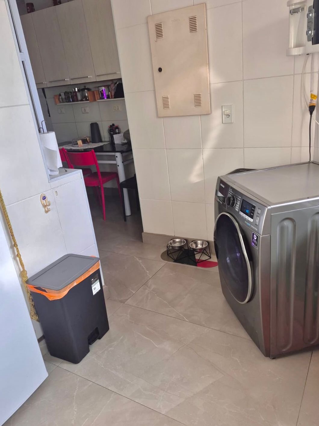 A lavanderia é ampla, organizada e com armários que facilitam a rotina.