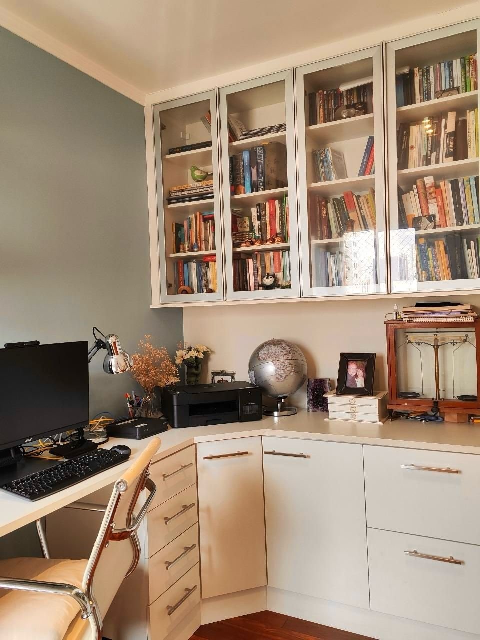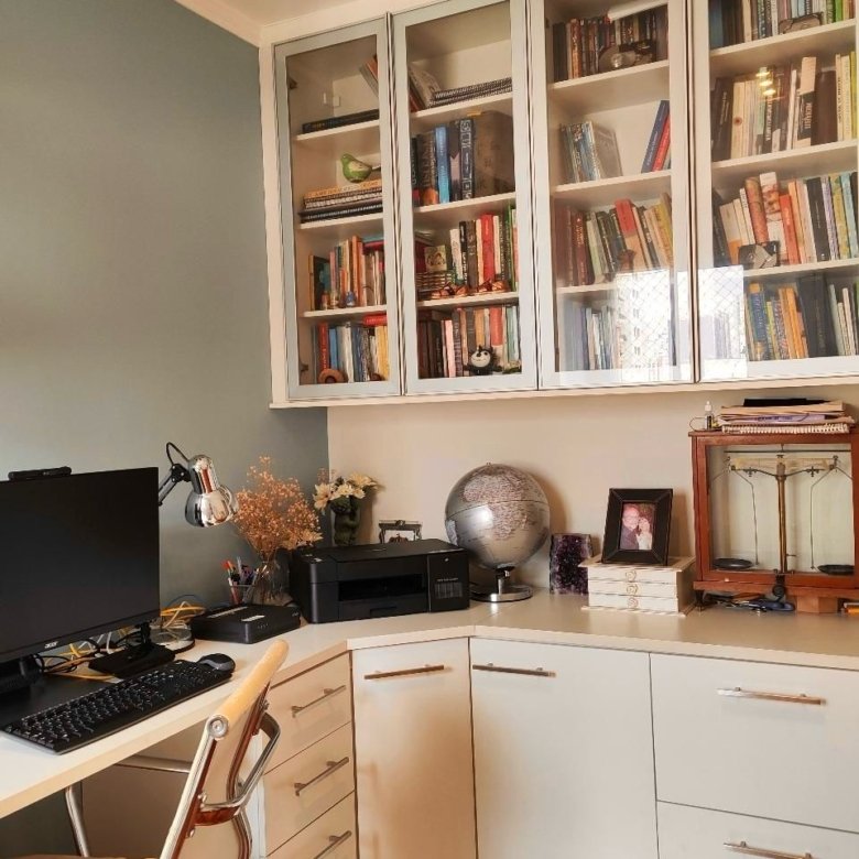 -Segunda suíte multifuncional com espaço para home office, armários e estantes envidraçadas