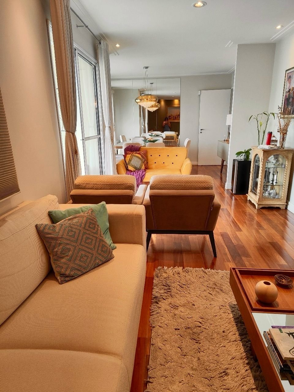 -Sala ampla e iluminada com piso de madeira, projeto de iluminação em LED e varanda envidraçada